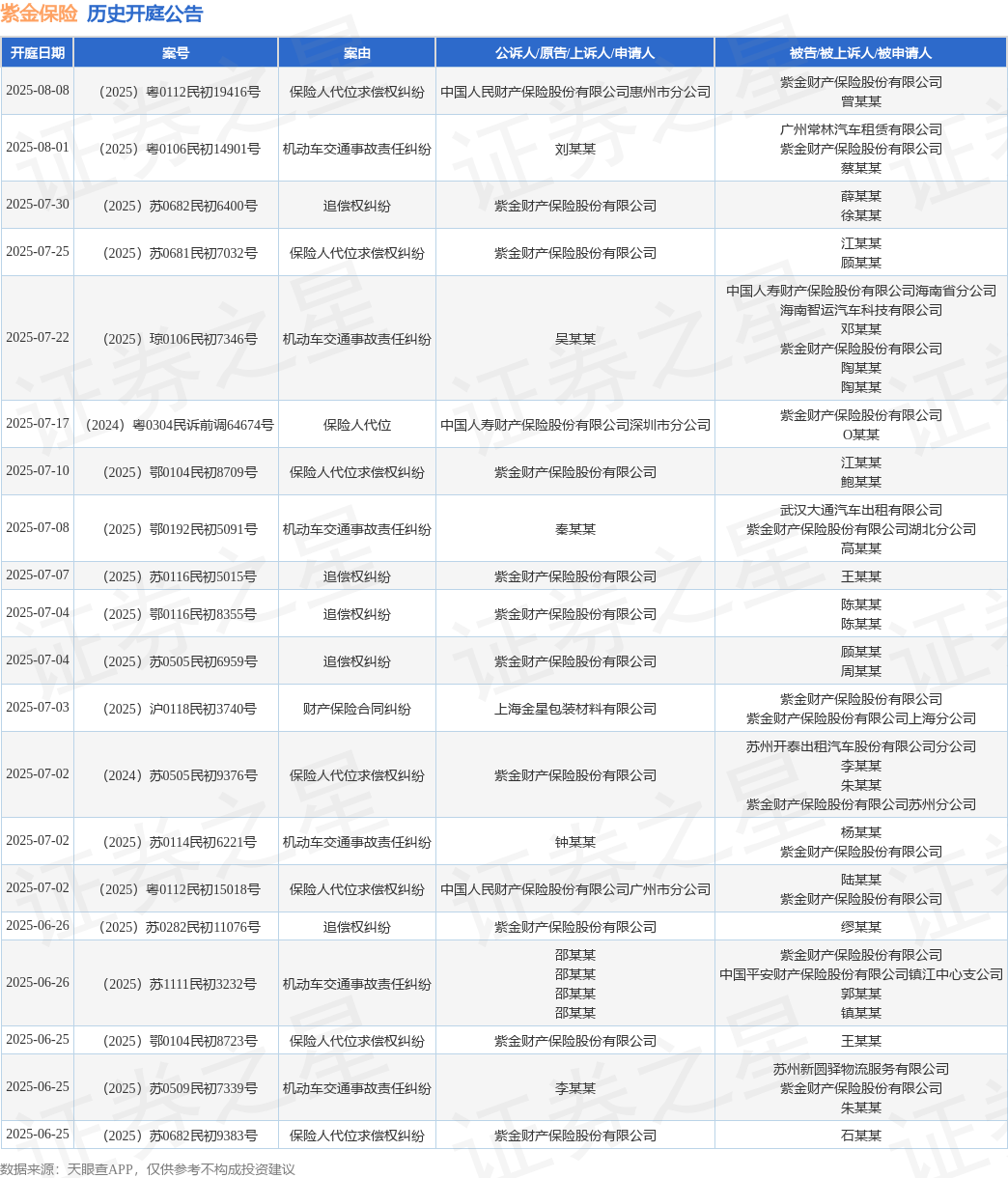 本站消息,根据天眼查APP显示,近日公布了一则紫金财产保险股份有限公司作为被告/被上诉人的开庭公告,详细内容如下: